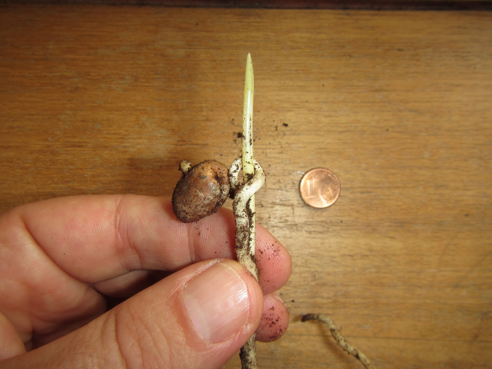 Primeiro rebenta a raiz que penetra fundo no solo. Depois, a alguns milímetros de distnacia da semente, nasce o caule (a partir da raiz) que se dirige para a superfície. Após cerca de 1 mês na terra a raiz já pode atingir facilmente os 10 cm de comprimento: